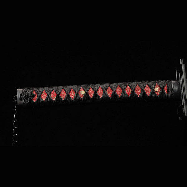 When removing the handle, pay attention to the blade facing forward, otherwise it will be dangerous. Japanese katana swords like dark red katana are very sharp, and a little carelessness can cause serious injury. First, clench the handle of the knife with the right hand and make a fist with the left hand, raise it to a height of about 30 cm above the right hand, aim at the tiger's mouth of the right hand holding the knife, and beat it down with moderate force. When you hit the tiger's mouth with your right hand, you will hear a crisp metallic sound, which is the pleasant sound of the cutting feather, the knife tang and the knife stem colliding with each other, indicating that you have succeeded. The stem (center) will jump out of the handle, and you can easily pull the knife out by holding the blade with two fingers of your left hand.